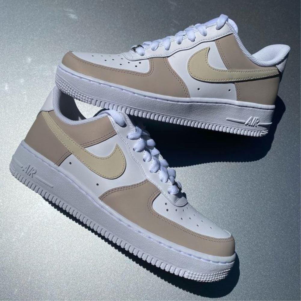 An eye-catching mix of beige and brown - these custom sneakers make a bold statement. Step up your shoe game with these Air Force 1s and show off your daring style.