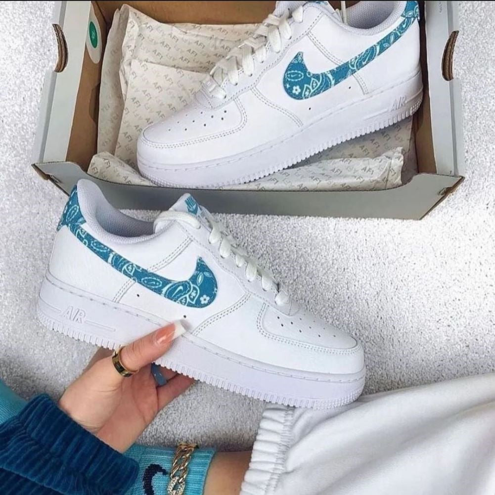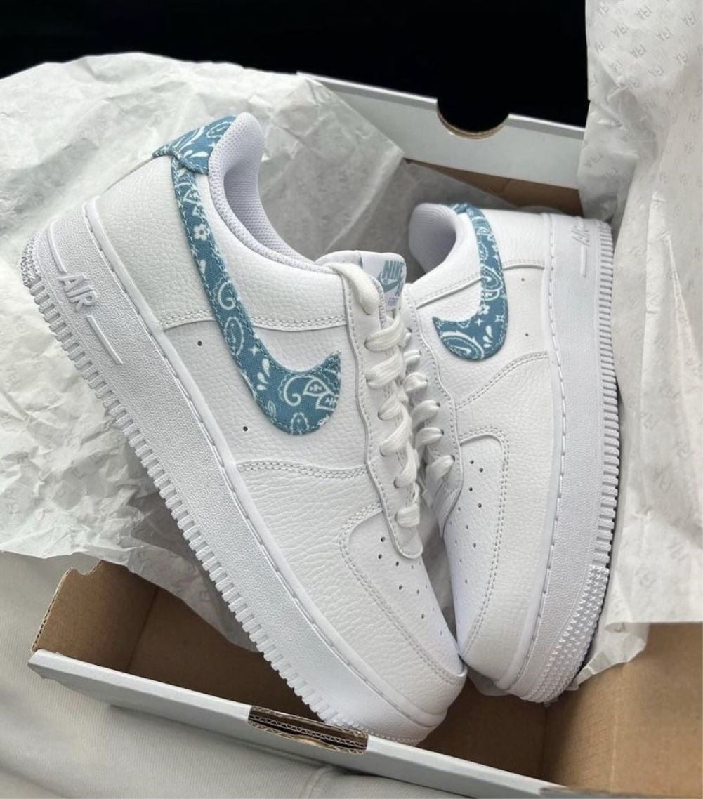 The Blue Bandana Sneakers Custom Air Force 1 feature a bright blue bandana print on ultra-soft leather for a unique look. Their lightweight design and cushioned insole offer superior comfort and support for all-day wear.