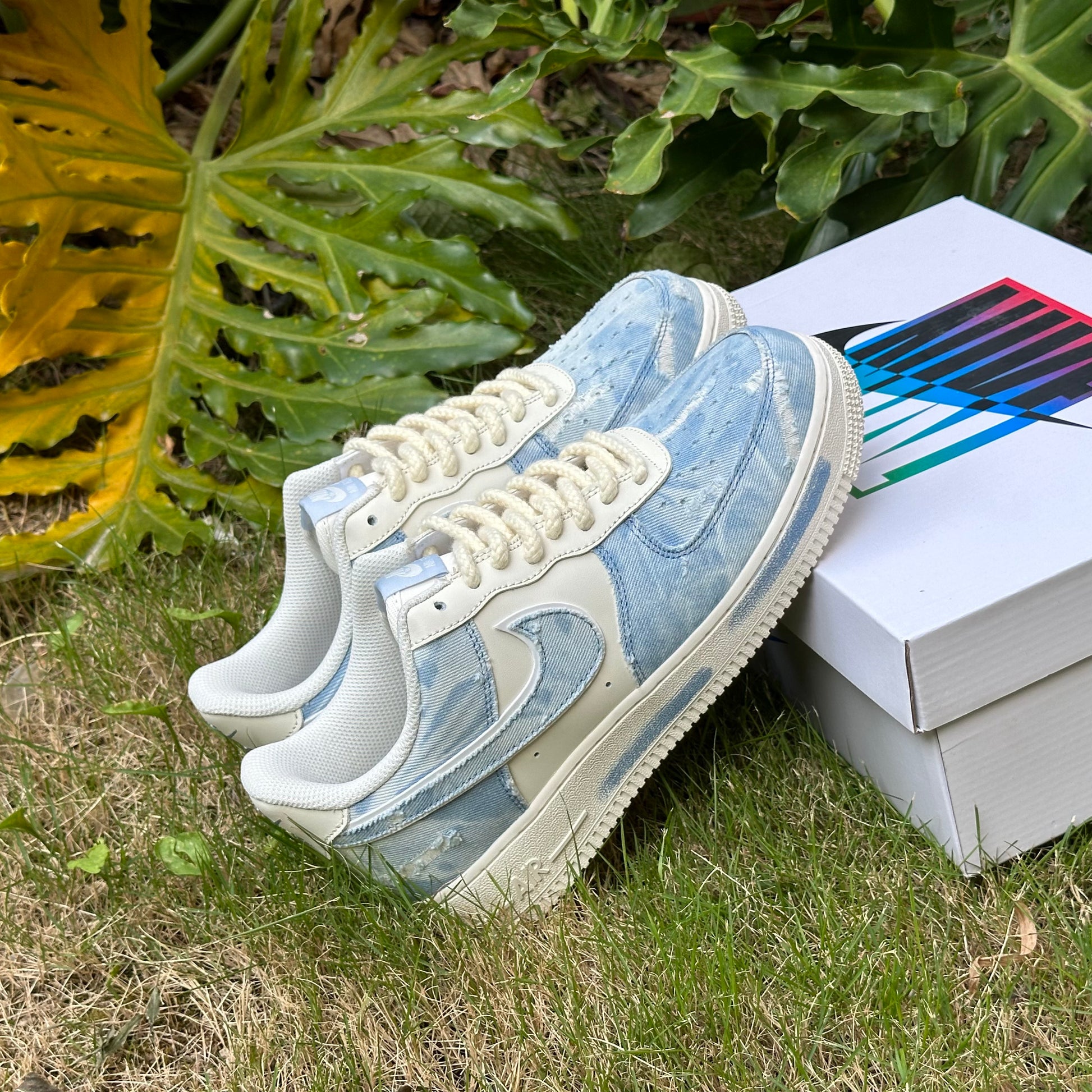 Elevate your sneaker game with our Custom Air Force 1 Blue White Denim Style. Handcrafted with premium materials, these custom AF1 sneakers are the perfect blend of style and comfort. Make a statement with unique, one-of-a-kind shoes that are sure to turn heads. Elevate your style game with our Custom Air Force 1s.